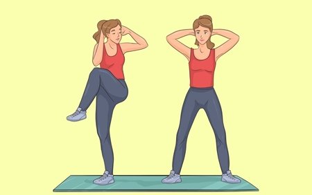 - Movimente a mão esquerda e leve o joelho em direção ao cotovelo direito;